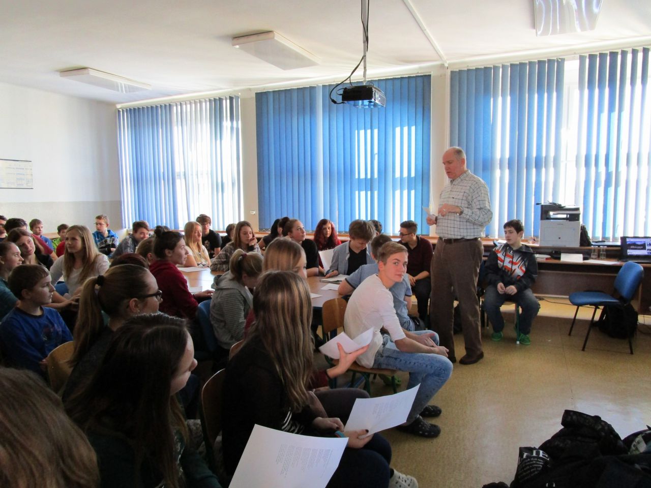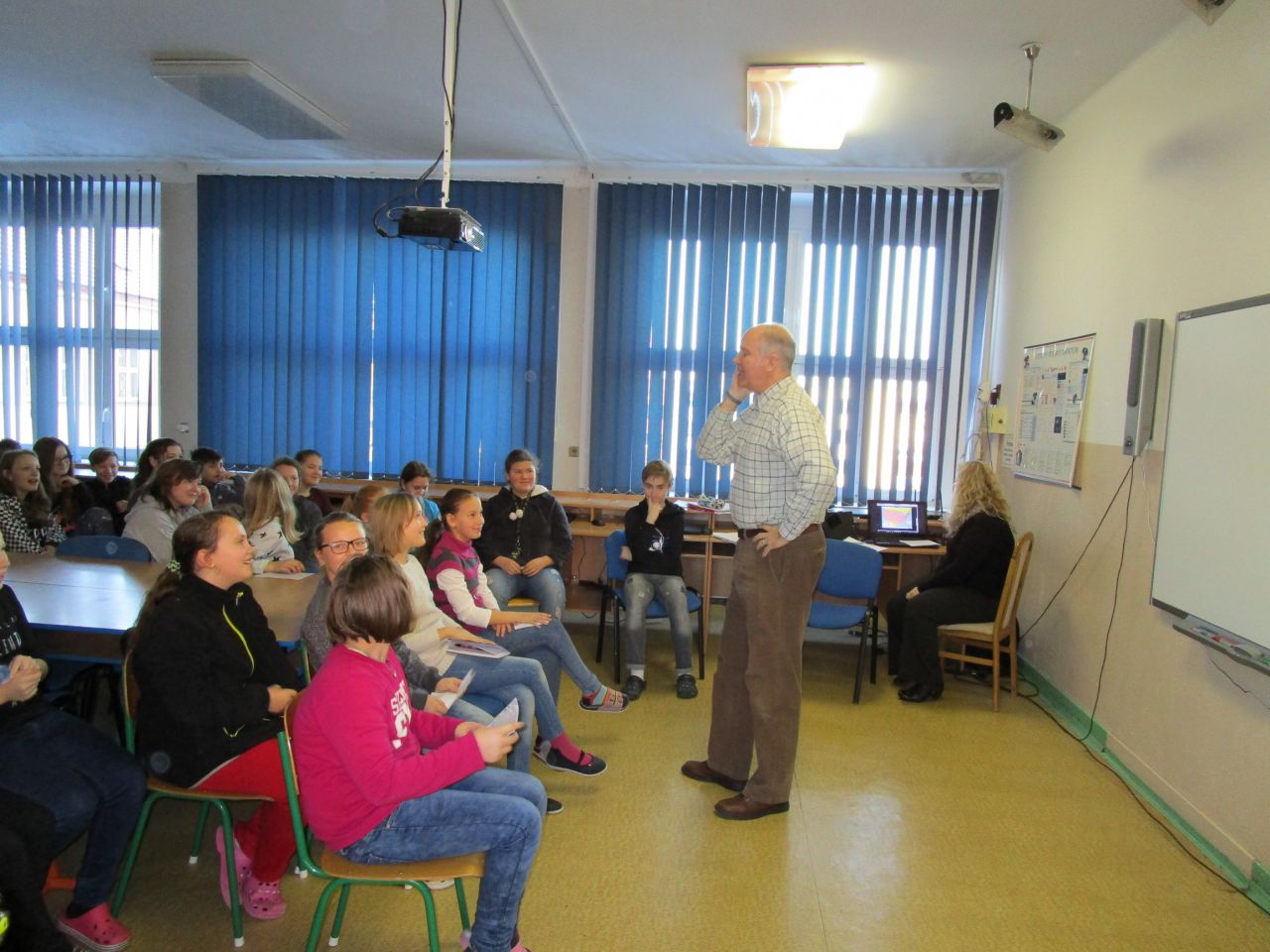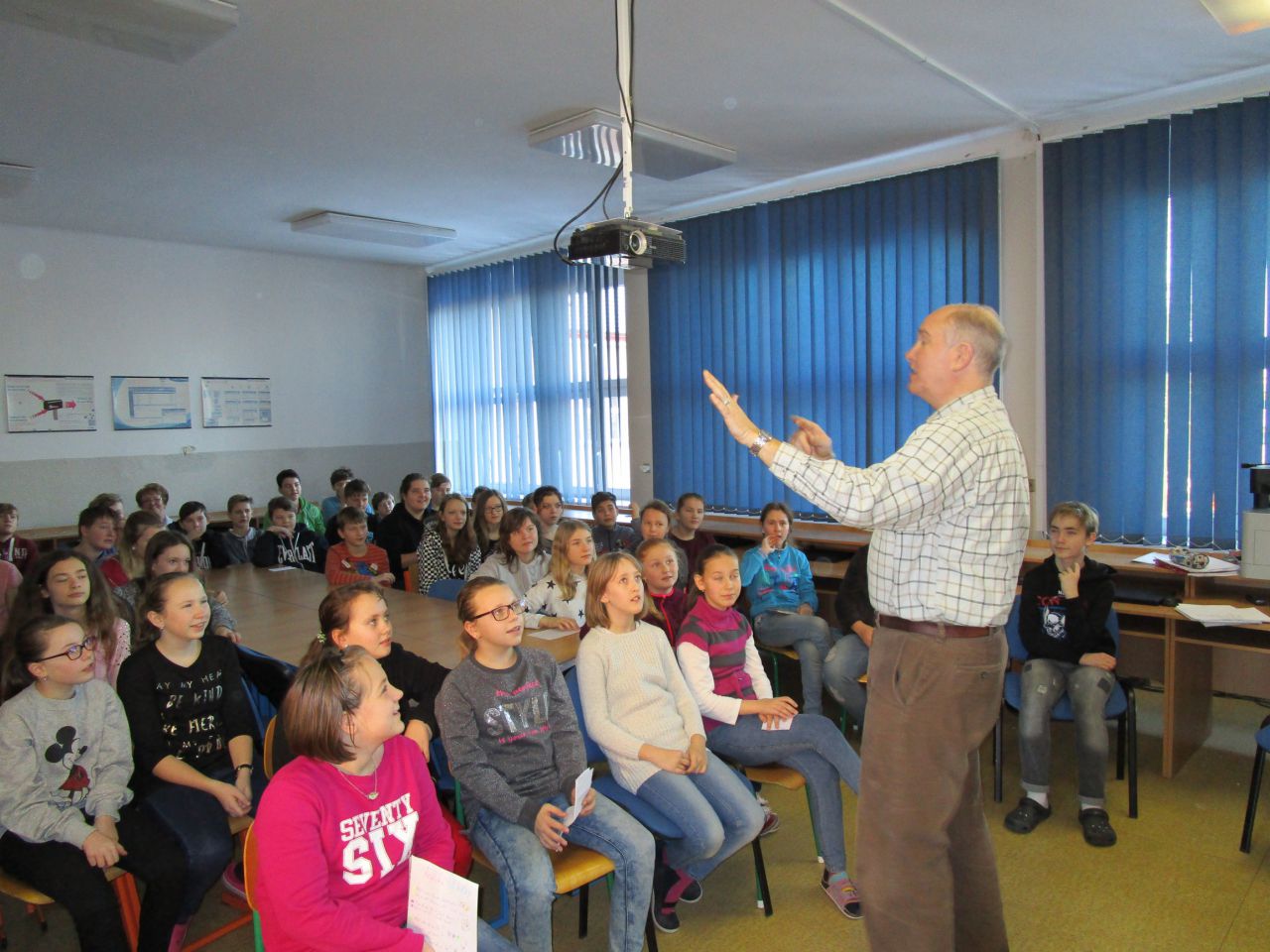 V průběhu své návštěvy se zmínil o tom, že by rád poznal české žáky, a tak slovo dalo slovo a vzniklo nádherné setkání. Žáci všech ročníků 2. stupně se seznámili s americkou country písničkou Take me home country roads, měli jedinečnou možnost zeptat se na cokoliv, co je zajímalo, a ověřit si, jak na tom jsou se svou angličtinou. Ukázalo se, že většina našich žáků se ve světě neztratí a bez problémů se domluví. Scottovi se splnilo přání, žáci a učitelé byli nadšení, takže co více psát… Snad jen…Scotte, mockrát děkujeme a těšíme se na příště!!!