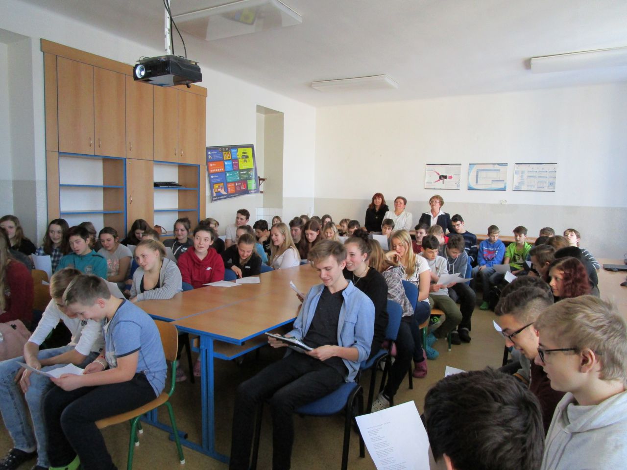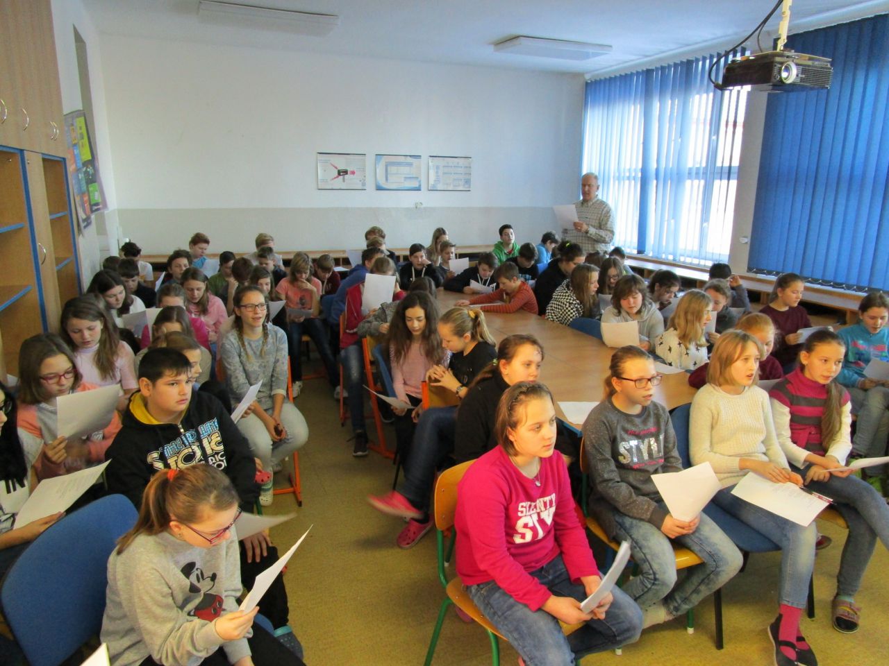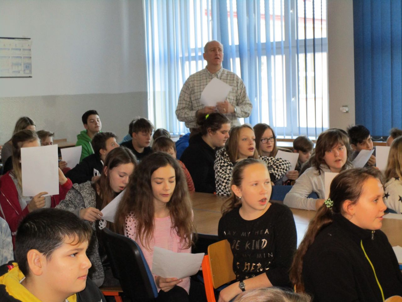 V průběhu své návštěvy se zmínil o tom, že by rád poznal české žáky, a tak slovo dalo slovo a vzniklo nádherné setkání. Žáci všech ročníků 2. stupně se seznámili s americkou country písničkou Take me home country roads, měli jedinečnou možnost zeptat se na cokoliv, co je zajímalo, a ověřit si, jak na tom jsou se svou angličtinou. Ukázalo se, že většina našich žáků se ve světě neztratí a bez problémů se domluví. Scottovi se splnilo přání, žáci a učitelé byli nadšení, takže co více psát… Snad jen…Scotte, mockrát děkujeme a těšíme se na příště!!!