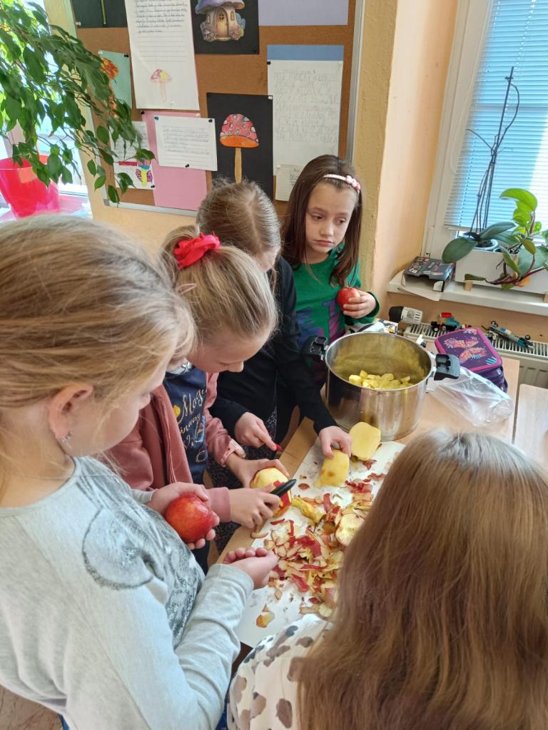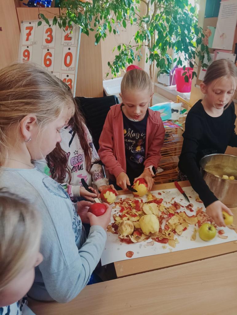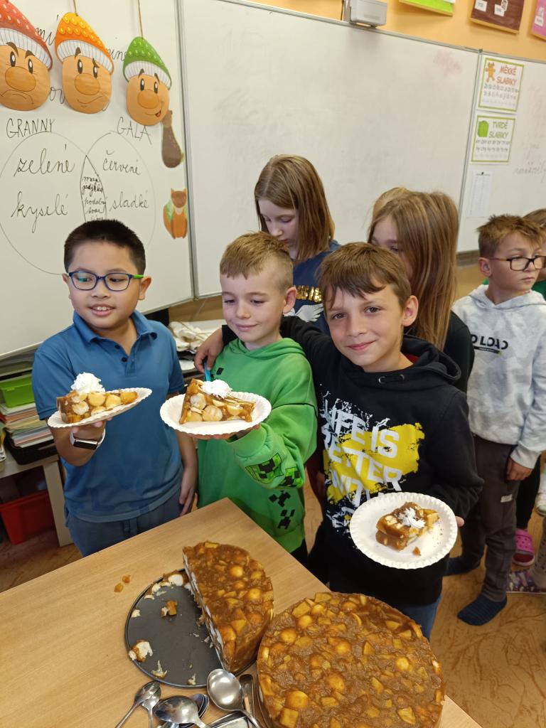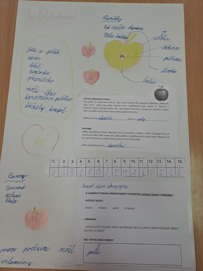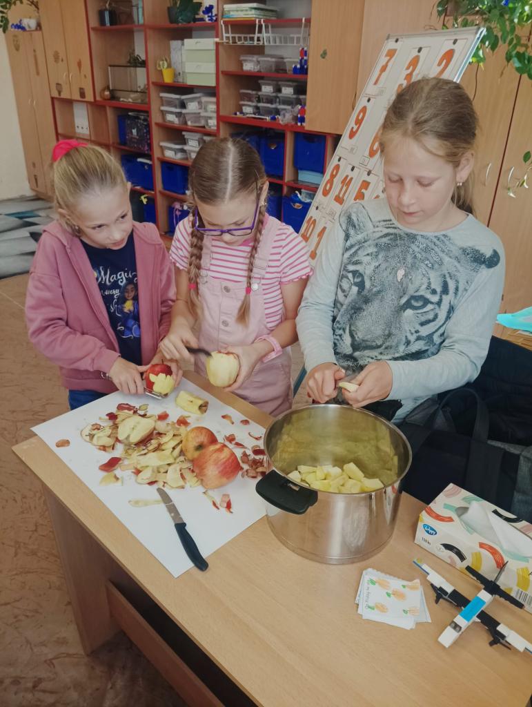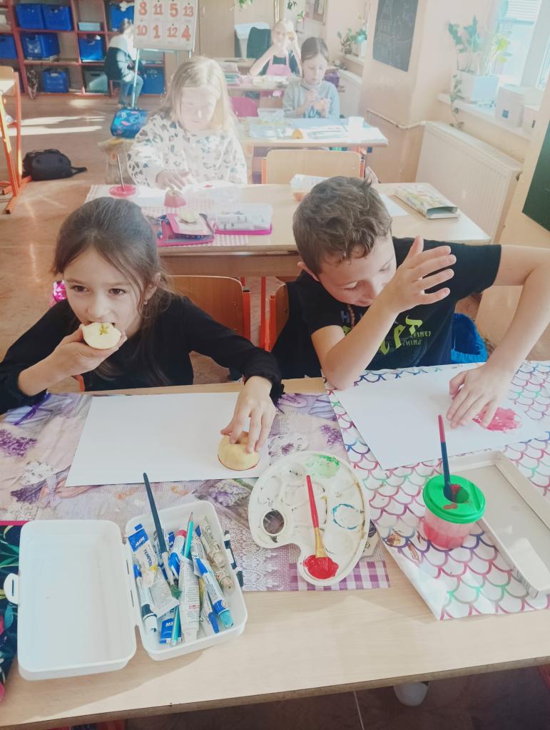 Děti se učily pracovat s textem, kde vyhledávaly a porovnávaly informace o různých odrůdách jablek. Na tabletech vyhledávaly přísloví, pořekadla a písničky. Ve výtvarné výchově děti obtiskávaly rozkrojená jablka, vystříhávaly a následně lepily na připravené papíry. V prvouce si jablko popsaly, řekly si, kde a jak ho využíváme a vyplnily si kvíz s tajenkou. Popovídaly si i o sklizni a uskladňování a dozvěděly se, proč jablko plave na vodě. Velmi šikovné byly děti zejména při loupání jablek a následné přípravě nepečeného jablkového dortu, který byl páteční svačinkou. Na závěr dopoledne si děti zatancovaly mazurku na písničku Měla babka čtyři jabka.