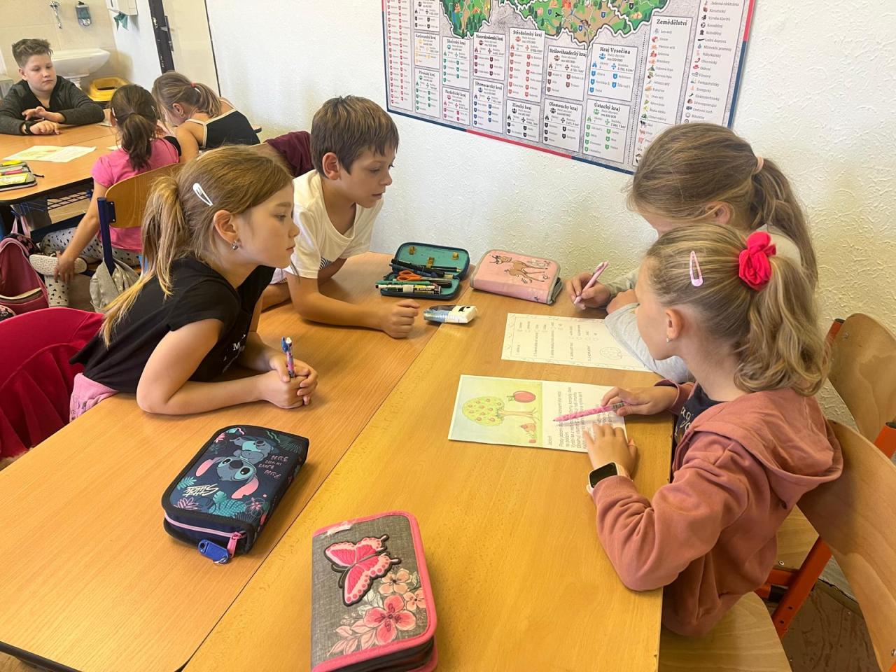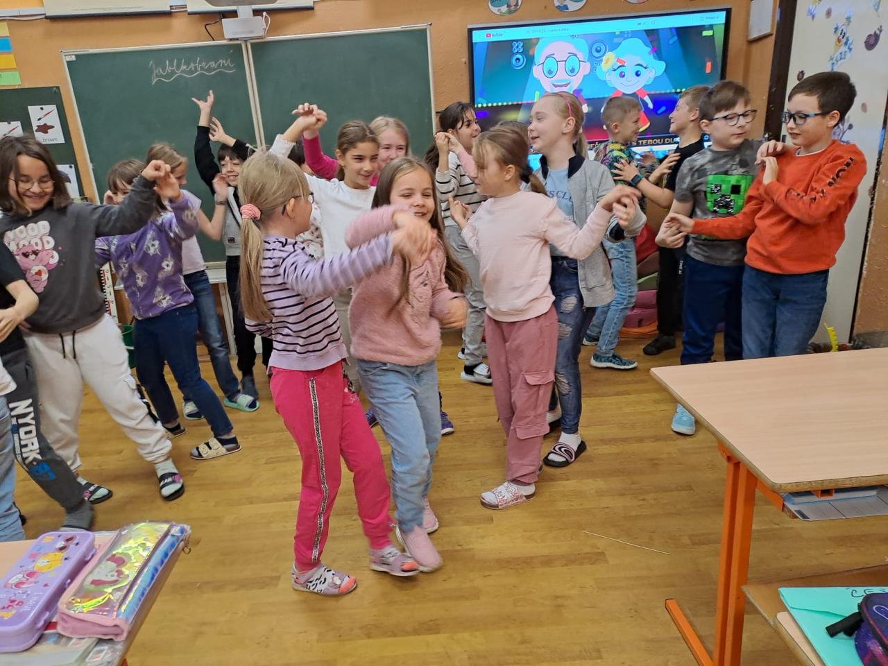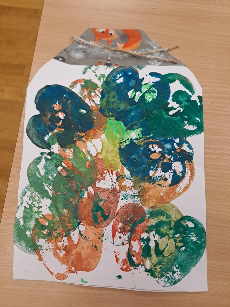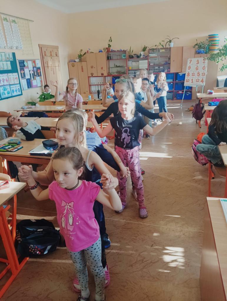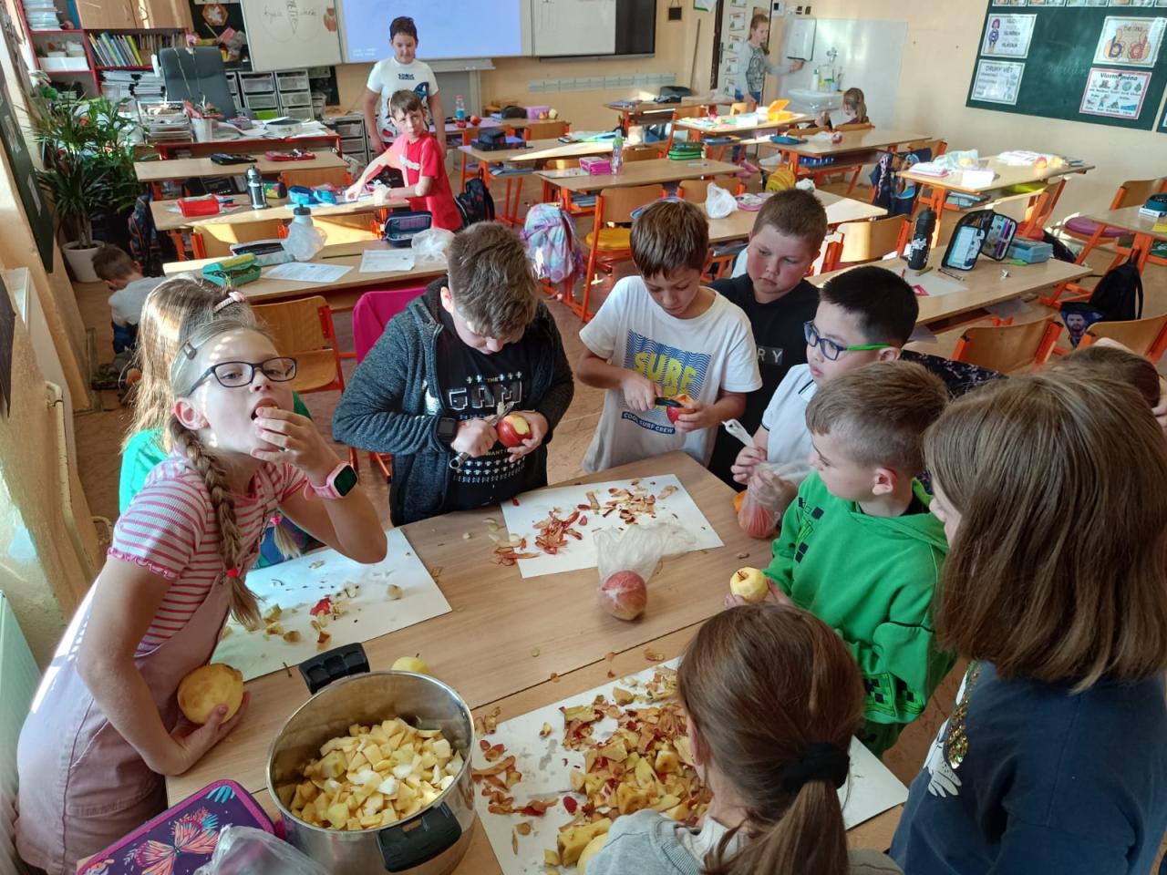 Děti se učily pracovat s textem, kde vyhledávaly a porovnávaly informace o různých odrůdách jablek. Na tabletech vyhledávaly přísloví, pořekadla a písničky. Ve výtvarné výchově děti obtiskávaly rozkrojená jablka, vystříhávaly a následně lepily na připravené papíry. V prvouce si jablko popsaly, řekly si, kde a jak ho využíváme a vyplnily si kvíz s tajenkou. Popovídaly si i o sklizni a uskladňování a dozvěděly se, proč jablko plave na vodě. Velmi šikovné byly děti zejména při loupání jablek a následné přípravě nepečeného jablkového dortu, který byl páteční svačinkou. Na závěr dopoledne si děti zatancovaly mazurku na písničku Měla babka čtyři jabka.
