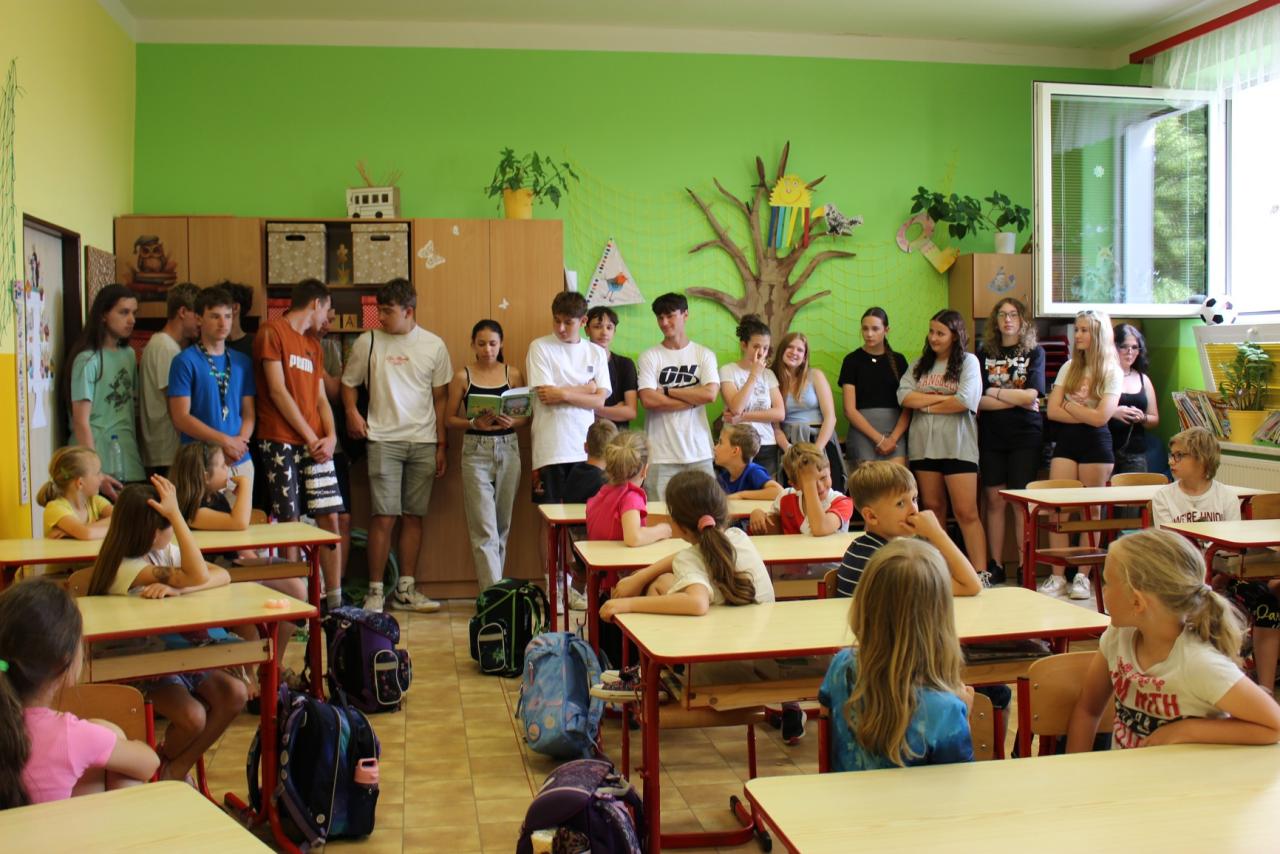 Prvňáčci si pro své deváťáky připravili čtení z oblíbené knihy Kouzelná třída v zoo. Tím ukázali, jak velký posun za rok udělali – od chvíle, kdy jim deváťáci předávali Slabikář, se z nich stali opravdoví čtenáři.